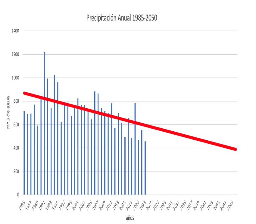 A continuación, se muestra de manera gráfica el efecto que ha tenido el cambio climático en la precipitación pluvial anual desde el año 1985, así como la proyección que resuelve el sistema operativo al año 2050 basada en datos históricos capturados.