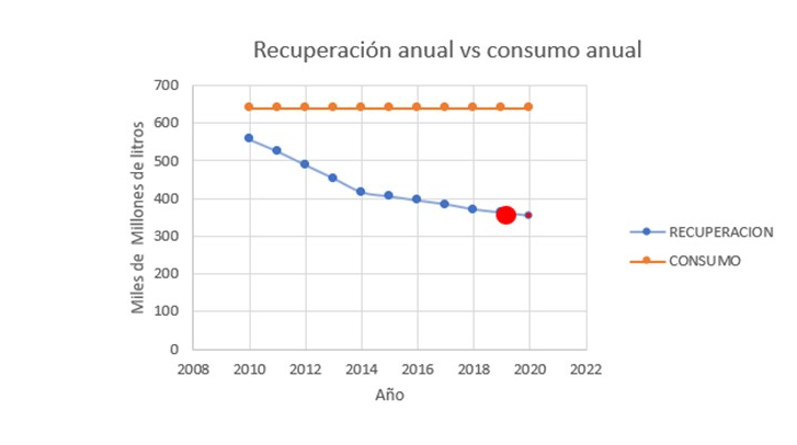 Como se puede observar en la siguiente gráfica, existe una demanda anual de 639 000 millones de litros en la Ciudad de México. Si calculamos el cociente de estas dos cifras nos arroja 159 por ciento actualmente, cifra cercana a los 141 por ciento reportada por la Conagua en 2023.