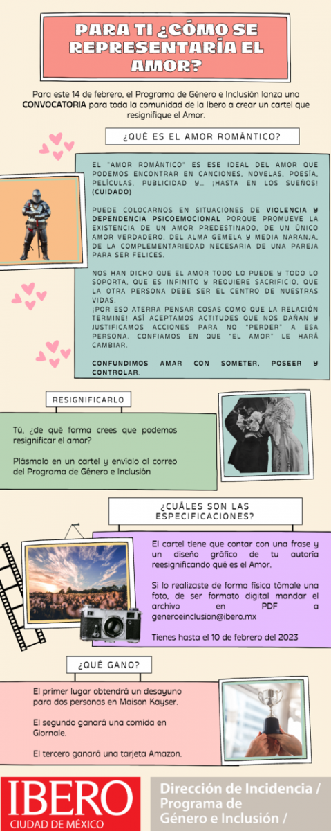 Y tú, ¿cómo resignificarías el amor? Son precisamente las juventudes las que nos van diciendo que ya hay esquemas muy caducos, destaca Elvia González del Pliego, y es por eso que el Programa de Género e Inclusión lanza esta convocatoria para que plasmes tus ideas en un cartel, que puedes enviar al correo generoeinclusion@ibero.mx. ¡Apresúrate, todavía tienes hasta el 10 de febrero!