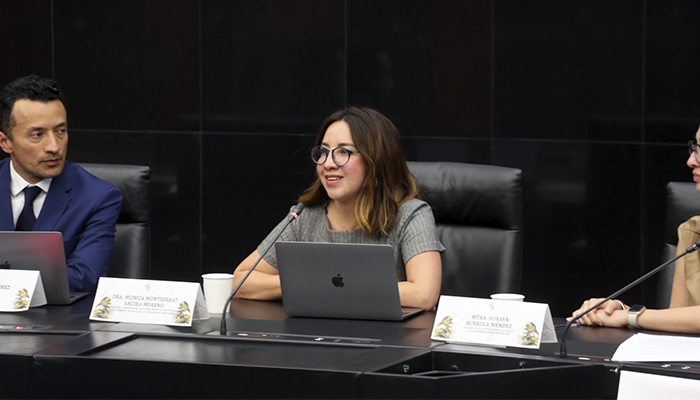 | La Dra. Mónica Ancira (izq.), académica del Departamento de Salud, quien lidera el Observatorio Materno Infantil de la IBERO, durante su presentación en el Senado. |