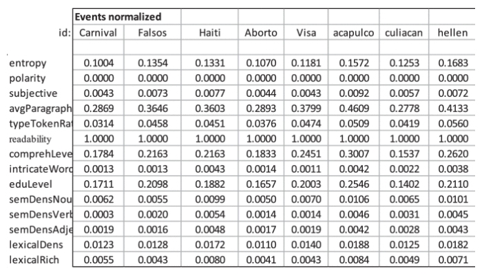 El Dr. José Emilio Quiróz Ibarra también usó la entropía de palabras, la cual mide la probabilidad de repetición de palabras en textos periodísticos y mediante el análisis de sentimiento (se realizó utilizando la biblioteca TextBlob de Python) clasificó las palabras como positivas, negativas o neutrales para evaluar su polaridad y subjetividad y detecta las emociones o las actitudes en los artículos de opinión.