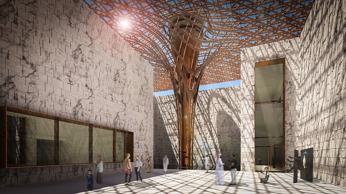 Se decidió reinterpretar la tipología tradicional de la torre de viento, transformándola en una escultura contemporánea que no sólo sirve como dispositivo de enfriamiento, sino que también agrega valor al espacio. Las torres de viento funcionan en conjunto con la estructura del techo dentro de los cinco patios del museo; de esta manera, todos los espacios al aire libre se benefician de los efectos del viento potenciado por la evaporación del agua de las piscinas.