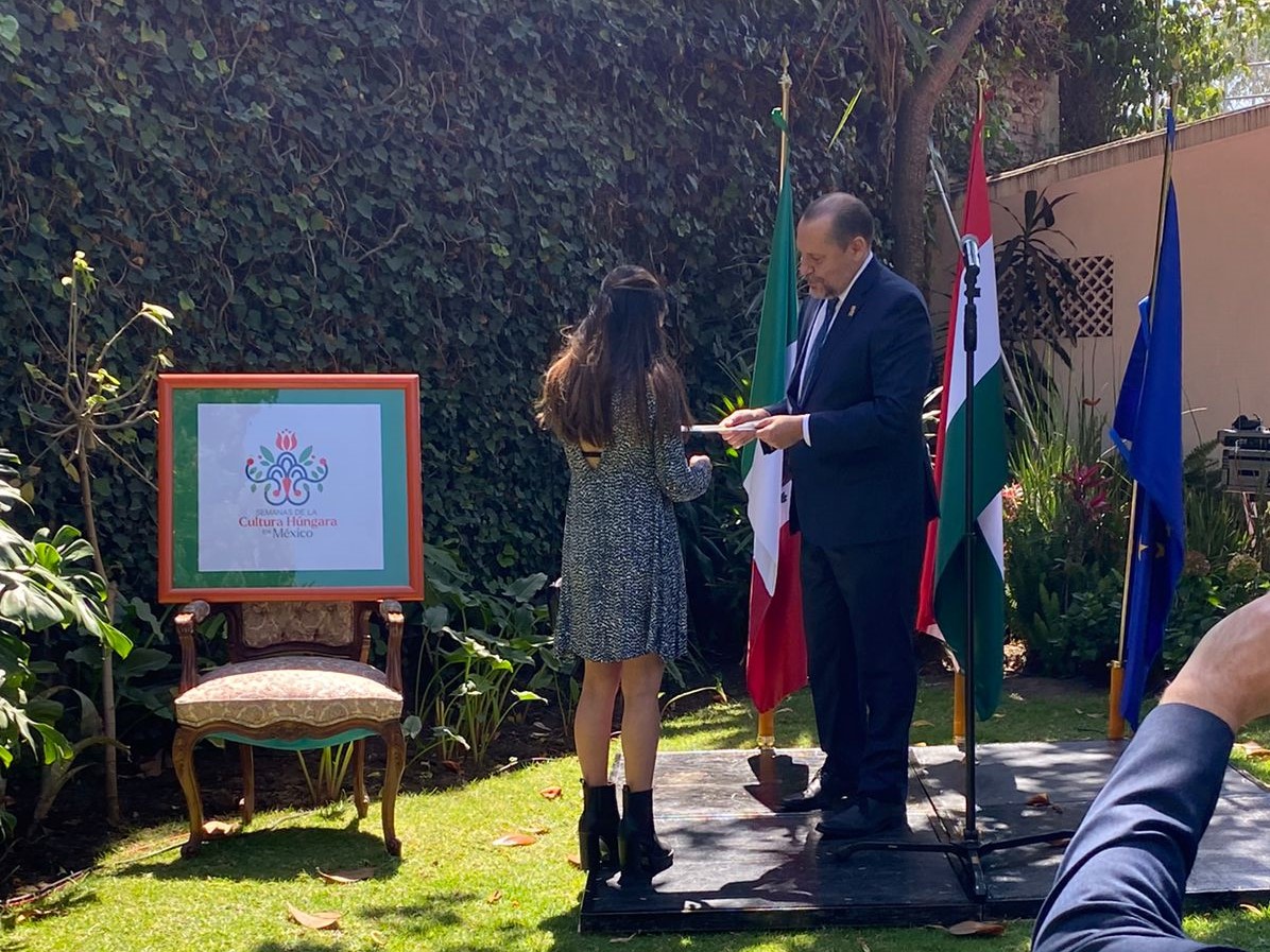 La estudiante de la IBERO asistió a una recepción para la comunidad húngara en la legación diplomática con motivo del aniversario de la Revolución húngara, en donde el embajador Zoltán Németh presentó el logotipo oficial de las Semanas de la Cultura Húngara en México, mismas que se llevarán a cabo de septiembre a diciembre de este año.
