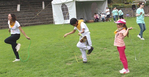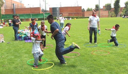 Durante tres horas las instalaciones deportivas de la universidad se convirtieron en una enorme sala de juegos con pasto natural, acondicionada con un inflable gigante al centro y ocho mostradores alrededor, donde los niños, cuyas edades iban de los cinco a los 12 años, pudieron aprender a hacer divertidas manualidades que los dejaron con sus manos y caras llenas de color y alegría.