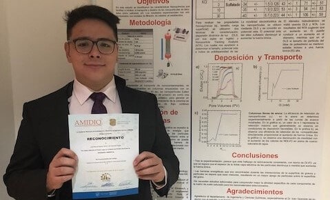Sin embargo, el alumno, con su trabajo 'Transporte de nanopartículas de látex sulfatado en medios porosos saturados', fue el ganador del primer lugar en la sesión de pósteres en el área de Ingeniería Ambiental del Congreso de la AMIDIQ 2018, que se celebró a principios de mayo en San José del Cabo, Baja California Sur.