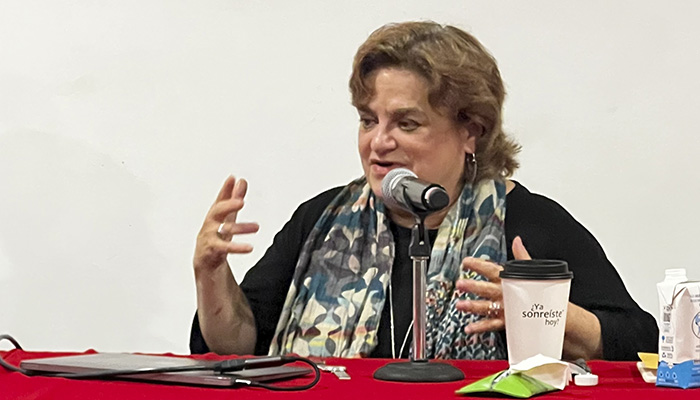 La Mtra. Tania Santamaría, psicoterapeuta grupal, invitó a las mujeres a “que todo nuestro ser y quehacer en este mundo sea feminista”. Foto: Yazmín Mendoza. |