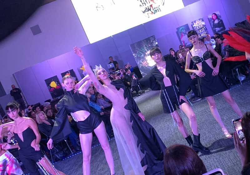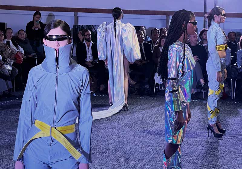 Este 2022, las 20 alumnas de octavo semestre que presentaron sus colecciones, que incluían 3 looks cada una, eligieron el arte y el cambio climático como hilos conductores de su pasarela de moda “ArtRuption”.