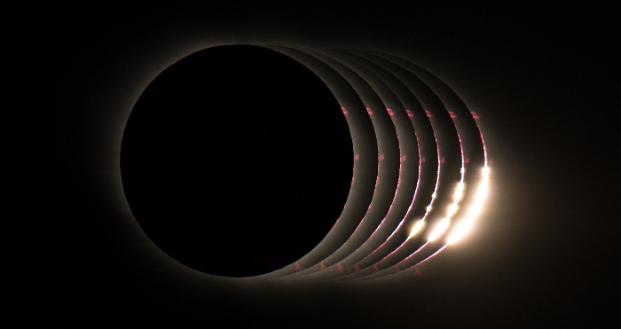 | Composición de fotografías del fenómeno conocido como Perlas de Baily en diferentes instantes de la totalidad de un eclipse de sol. Foto: Wikipedia / Luis Rojas M. |