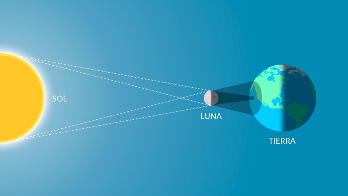 ¿Dónde se verá como total el eclipse del 8 de abril y dónde como parcial? La especialista comenzó por explicar cómo es que ocurren los eclipses. Cuando la Luna se coloca entre la Tierra y el Sol, se generan dos conos de sombra; el menor, llamado umbra, es donde se bloquea toda la luz del sol, y las zonas de la Tierra en este cono ven el eclipse como total. El cono mayor, llamado penumbra, es la zona donde sólo se bloquea parcialmente la luz, y las zonas de la Tierra en este cono ven el eclipse como parcial.