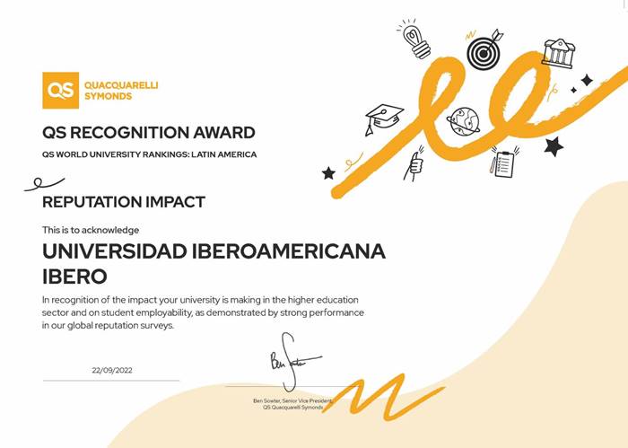 Cabe destacar, que estos reconocimientos se suman al PremioEmployer Reputation Impact,que en 2022 recibió la Universidad Iberoamericana por parte de Quacquarelli Symonds (QS), una compañía británica que es considerada una de las mayores especialistas en educación y estudios en el extranjero.