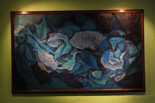 La sala contigua muestra cómo el Padre Miguel Aguayo exploró el uso de las gasas, que entintó con distintos colorantes para utilizarlas como elemento pictórico, para lograr formas redondeadas muy orgánicas, biológicas y acuíferas, “altamente eróticas todas ellas”, las cuales despiertan más directamente el sentido del tacto.
