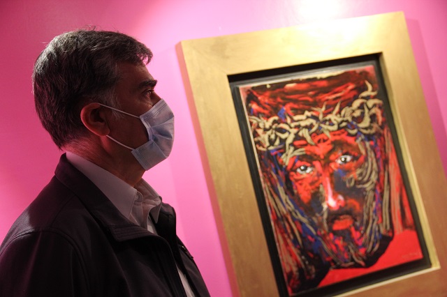La última sala está dedicada al corazón humano en desolación, en tribulación, derrotado, destruido. Ahí se encuentran ‘Los lienzos de la verónica’, rostros de Cristo que hablan de dos crucifixiones. Una es la crucifixión humana, porque “todos eventualmente estamos crucificados por alguna situación en la vida”. La otra es el hecho de que “tenemos un Dios que no está hablando desde las alturas o desde la gloria, sino que está hablando desde la Cruz. Es el Dios mismo crucificado que mira nuestra Cruz”. Esa es precisamente la penuria compartida, la cruz de la cruz.