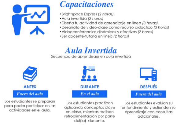 El Plan consistió en 15 horas formativas, distribuidas en seis cursos impartidos a distancia:Brightspace Express, Aula invertida, Diseña tu actividad de aprendizaje en línea, Desarrollo de video-clases como recurso didáctico, Videoconferencias dinámicas y efectivas y Ser docente-tutor/a en línea. Asimismo, la Coordinación Académica de la DEC realizó acciones de reforzamiento de la capacitación para los (as) nuevos (as) docentes e impartió clases sobre el manejo de Zoom, por demanda. Las constantes nuevas contrataciones generadas por los nuevos cursos y diplomados implica que los procesos de capacitación docente sean una tarea inacabable, permanente y muy exigente.
