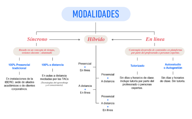 En las modalidades híbridas, los programas incluyen combinaciones de clases presenciales y en línea, a distancia y en línea, incluso, presenciales, a distancia y en líneahibridadasen un mismo curso o diplomado. Para fines comerciales y de difusión, hemos llamado tambiénhíbridasa las combinaciones al interior de la modalidad sincrónica; por ejemplo, la oferta académica que intercala clases presenciales y a distancia en proporciones específicas de salida al público, pero que pueden flexibilizarse según las circunstancias; y en el caso de la modalidad asincrónica se pueden crear cursos y diplomados en línea cuyos desarrollos hibriden esquemas tutorizados y autogestivos, según convenga a los resultados de aprendizaje que requiere el estudiantado.