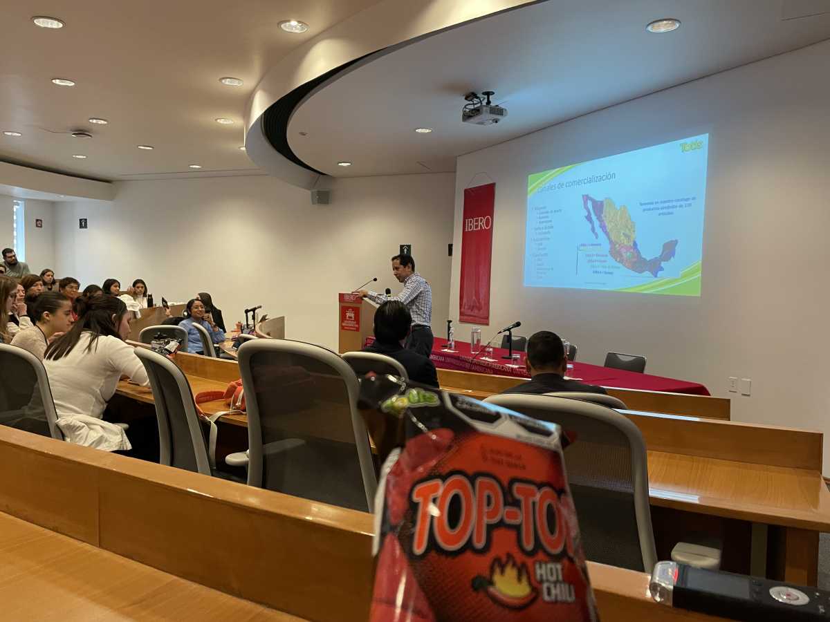 Durante más de hora y media, el Dr. Diaz le explicó a las y los estudiantes de Ingeniería en Alimentosde la IBERO, cuáles son los procesos químicos detrás de sus creaciones, cuáles son los retos que enfrenta la industria de las botanas tanto en México como a nivel internacional y en qué proyectos académicos colabora la empresa con investigadoras e investigadores de diversas universidades.