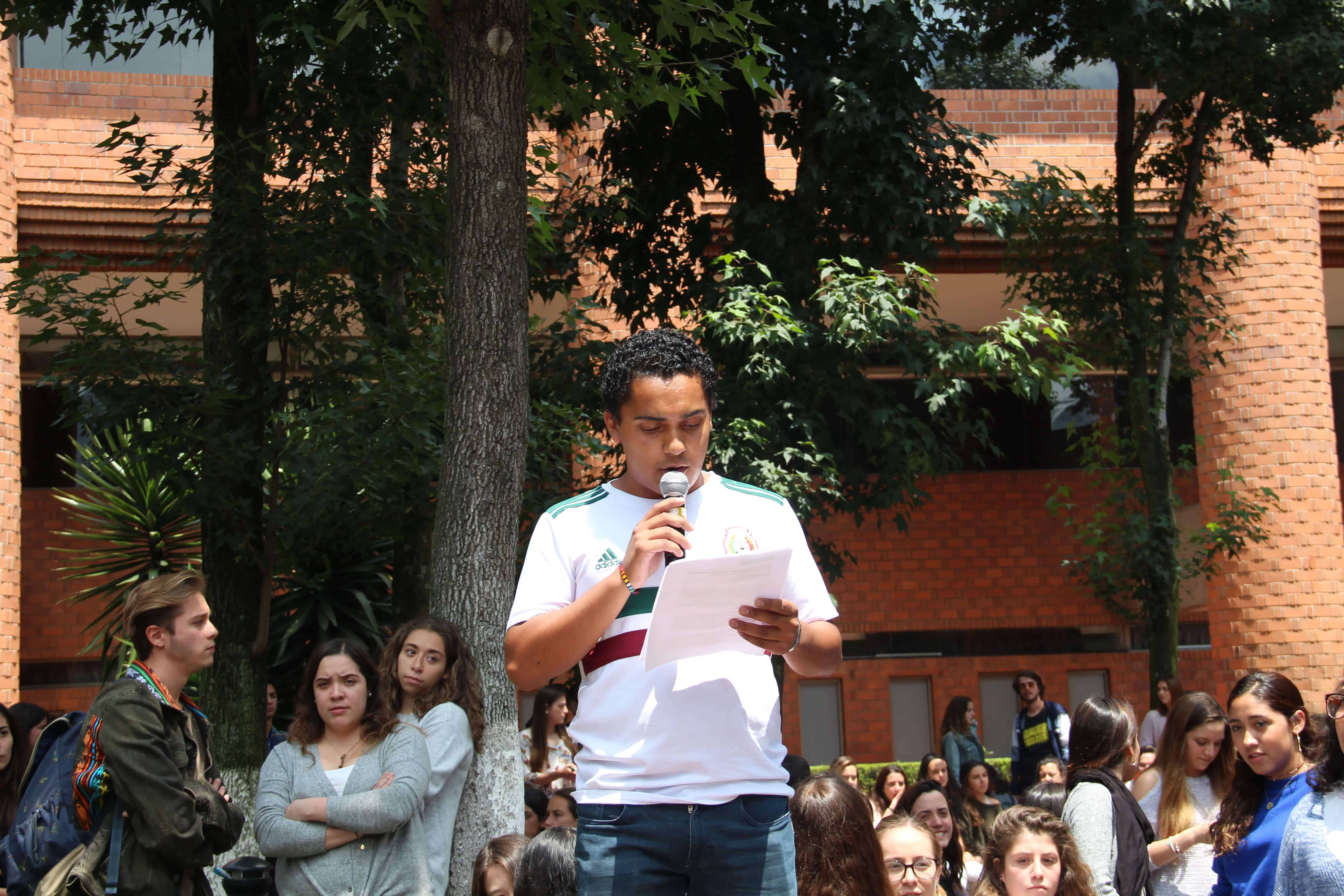 Carmen Domínguez, Raquel Masry y Juan Manuel Silva , ubicados en diferentes puntos de la IBERO, leen el Manifiesto 19S: ‘Hoy hace un año, hoy hace 33 años’. Los estudiantes, profesores y trabajadores escuchan atentos y reconstruyen el caos.