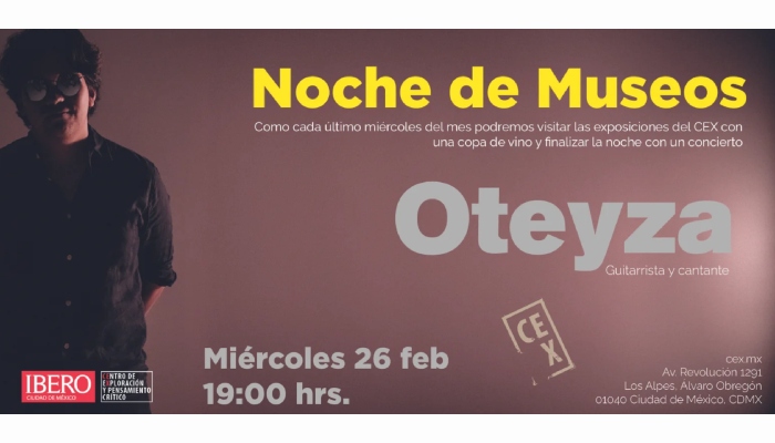 El Centro de Exploración y Pensamiento Crítico (CEX) de la Universidad Iberoamericana alista para el 26 de febrero la próxima edición de su Noche de Museos, que contará con el músico Oteyza para llevar a las y los asistentes a un viaje cultural a través de su música.