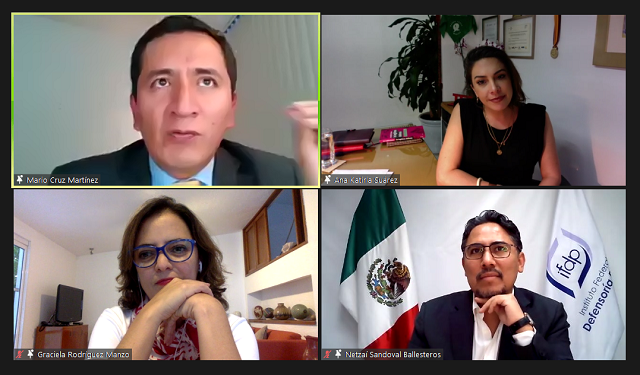 La mesa de diálogoAcceso a la justicia: desafíos y propuestas en Méxicofue moderada por el Dr. Mario Cruz Martínez, académico del Departamento de Derecho la IBERO, universidad jesuita de la Ciudad de México; y en ella también participaron la Mtra. Graciela Rodríguez Manzo, directora ejecutiva de la Comisión Mexicana de Defensa y Promoción de los Derechos Humanos; y el Lic. Netzaí Sandoval Ballesteros, director del Instituto Federal de Defensoría Pública.