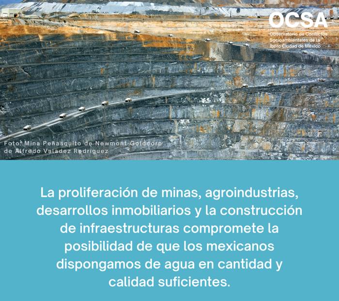 La disputa por el uso, el acceso y el control de este bien da lugar a conflictos entre las poblaciones y los responsables de los proyectos. El Observatorio de Conflictos Socioambientales de la Universidad Iberoamericana Ciudad de México( ocsa ) documenta, analiza y mapea proyectos extractivos que detonan conflictividad socioambiental en el territorio mexicano.