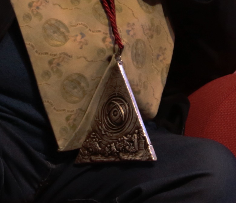 La insignia triangular que cuelga del cuello de los Doctores en estas ceremonias, se inspira en el grabado del techo del Aula Matemática del Klementinum, de la Biblioteca Nacional de Praga
