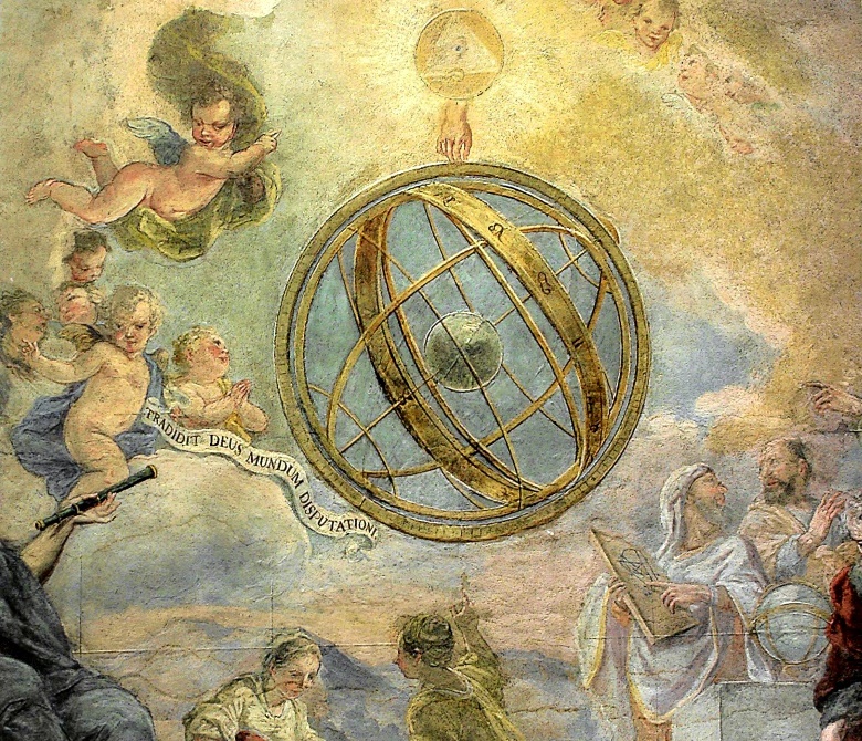 Lo interesante de la imagen es que muestra la mano de Dios representado por un triángulo, que es la Trinidad, y un dedo que se muestra sobre la Tierra, al lado puede leerse la leyenda: “Tradidit Deus mundum disputationi” (Dios puso al mundo para ser discutido), que resulta por demás elocuente, si consideramos que corrían los tiempos en que la llamada revolución científica se fraguaba a contracorriente. Comenta el Dr. Bermeo que la condena de Galileo en 1633 es probablemente el símbolo de un pensamiento que buscaba abrirse paso en un mundo de creencias.