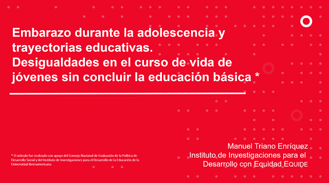 El embarazo durante la adolescencia -entre los 12 y 19 años- no necesariamente provoca la salida de la escuela por parte de ellas, reveló la investigaciónEmbarazo durante la adolescencia y trayectorias educativas. Desigualdades en el curso de vida de jóvenes que no habían concluido la educación básica, coordinada por el Dr. Manuel Triano Enríquez, investigador invitado del Instituto de Investigaciones para el Desarrollo con Equidad (EQUIDE)de la Universidad Iberoamericana Ciudad de México.
