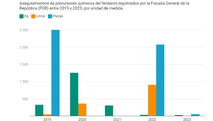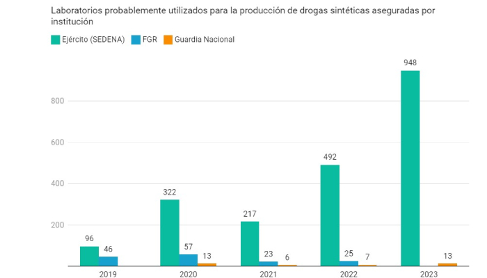 Sobre los laboratorios, ninguna de las autoridades federales consultadas por el Programa posee información sobre espacios para sintetizar estos químicos. La FGR y GN solo tienen registros de laboratorios clandestinos sin determinar el tipo de sustancia.