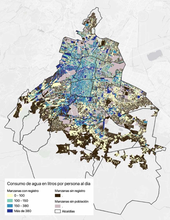 De acuerdo con datos del Censo de Población y Vivienda 2020 del INEGI, en la Ciudad de México existen un total de 2,711,894 viviendas particulares habitadas agrupadas en 1,814 colonias. Cerca del 50% de esas viviendas se ubican en colonias en donde más del 70% cuentan con tomas de agua potable con servicio medido o consumo promedio. Así un total de 1,341,757 viviendas se dividen en consumos alto, medio bajo y popular, que en promedio tienen un consumo diario de 137 litros por persona. El resto, un total de 1,370,137 viviendas, se ubican en colonias que en su mayoría o totalidad no cuentan con medidor de agua o consumo promedio. Si bien estas viviendas se localizan en las 16 alcaldías de la ciudad, Iztapalapa, Tlalpan, Magdalena Contreras, Tláhuac, Gustavo A. Madero, Xochimilco, Cuajimalpa, Alvaro Obregón, Coyoacán y Milpa Alta concentran la mayor cantidad de viviendas con servicio de agua intermitente o por tandeo, en las que no es posible determinar el promedio de consumo diario de agua.