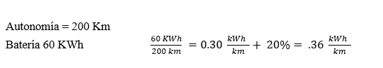 0.30 KWh es la energía consumida por kilómetro recorrido. Si en promedio un auto recorre 40 km por día tendríamos el consumo diario de un solo auto: