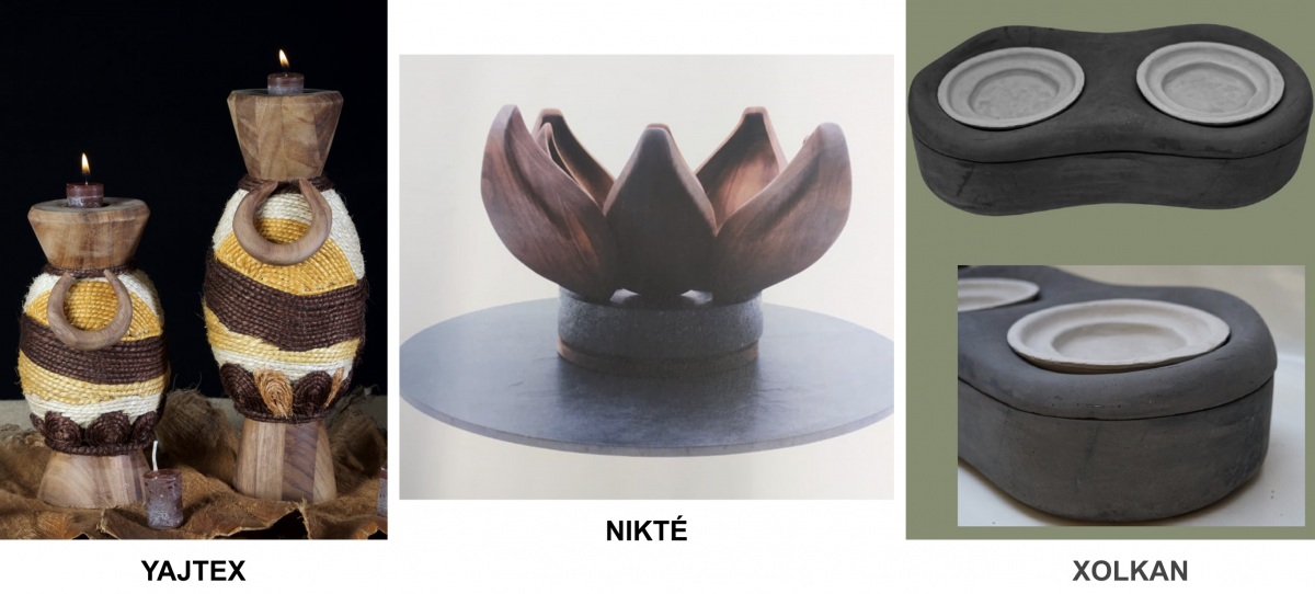 Yajtex. Son candelabros inspirados en la leyenda yucateca “El tigre y la escarabaja”, en la que un grupo de pequeños, pero bravos insectos, guiados por una escarabaja, se enfrentan a un ejército de enormes animales que comanda un tigre. El relato busca explicar el respeto y la armonía así como plasmar texturas y paisajes de Yucatán a través del hilo henequén y la madera de parota. Alumnas: Diana Fragoso y Montserrat Bisogno.
