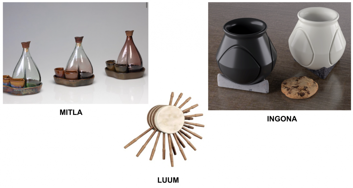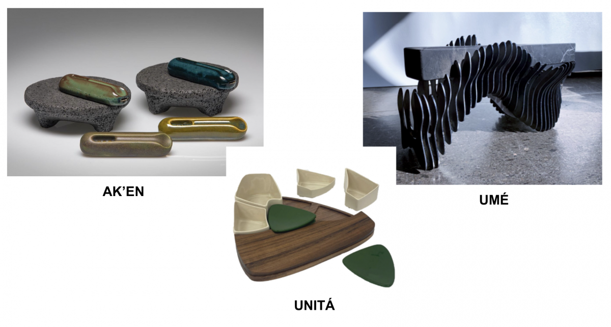 Mitla. Pensado para honrar y compartir mezcal y otros destilados de agave, es un juego conformado por cinco piezas, que hacen alusión a las alas de la mariposa monarca. Estudiantes: Atziri Guzmán, Ximena Gamboa y Natalya Meneses.
