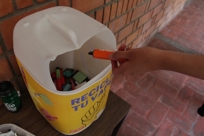 Naiara Cruz Ramírez Carrera, participante del taller y estudiante de intercambio de la Universidad Antonio Cruz de Montoya, de Lima, Perú, explicó que losvapesrecolectados serán canalizados a la empresa Recicla Electrónicos México, para garantizar la adecuada disposición de sus baterías de litio. Las y los estudiantes promueven la recolección con un intercambio: unvapea cambio de un pequeño dulce.