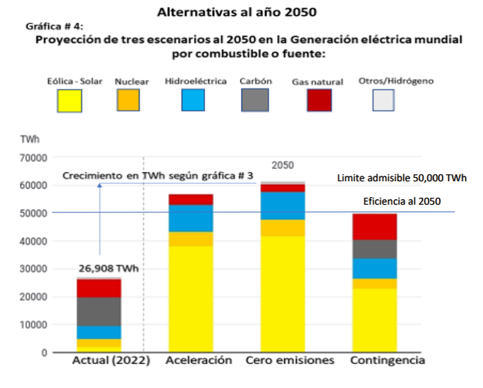Ante la proyección de contingencia, la generación energética mundial crece de los 26,908 hasta los 50,000 TWh para el 2050; y ese es el límite para reducir los impactos ambientales asociados. Es una estrategia clave para lograr un sistema energético más sostenible y contribuir a la mitigación del cambio climático. De no lograr implantar una distribución y eficiencia energética, tendremos seguramente consecuencias significativas para toda la humanidad.