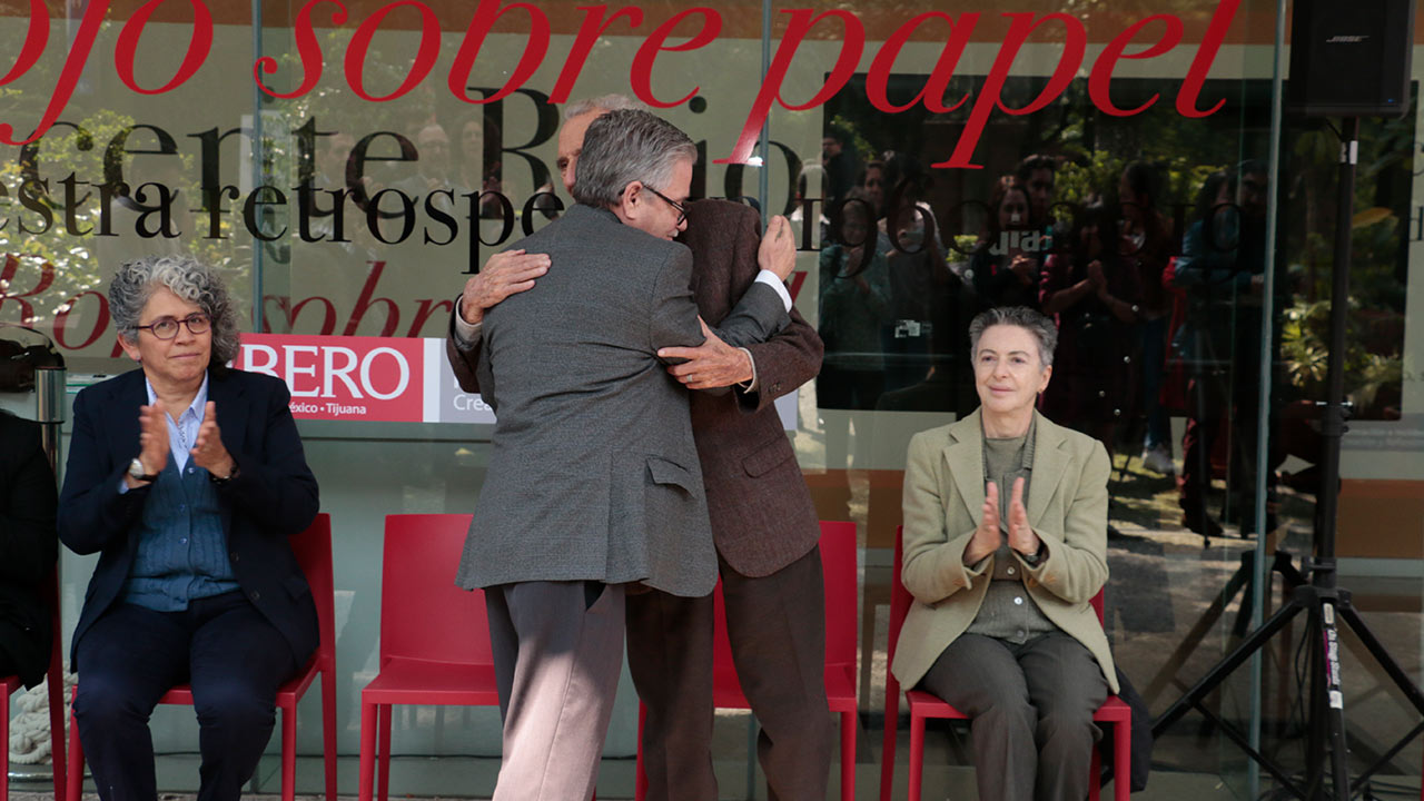 Al evento asistieron Vicente Rojo y su esposa, Bárbara Jacobs; el Rector de la IBERO, Mtro. David Fernández Dávalos; la Mtra. Georgina Tepale, directora de Formación Ignaciana; y la Mtra. Araceli Téllez, titular de la Dirección General de Formación e Incidencia Ignacianas.