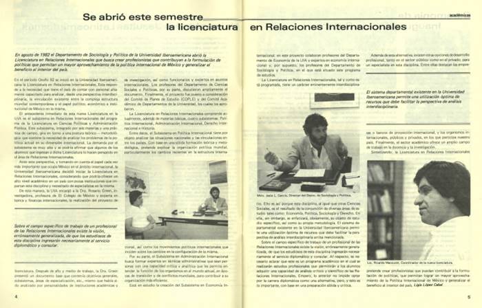 A inicios de los años ochenta, la Universidad, durante la rectoría del Dr. Carlos Escandón, le pidió a la profesora Rosario Green que diseñara el programa para una próxima apertura de la carrera en la IBERO. El proyecto fue muy creativo e innovador en su momento.