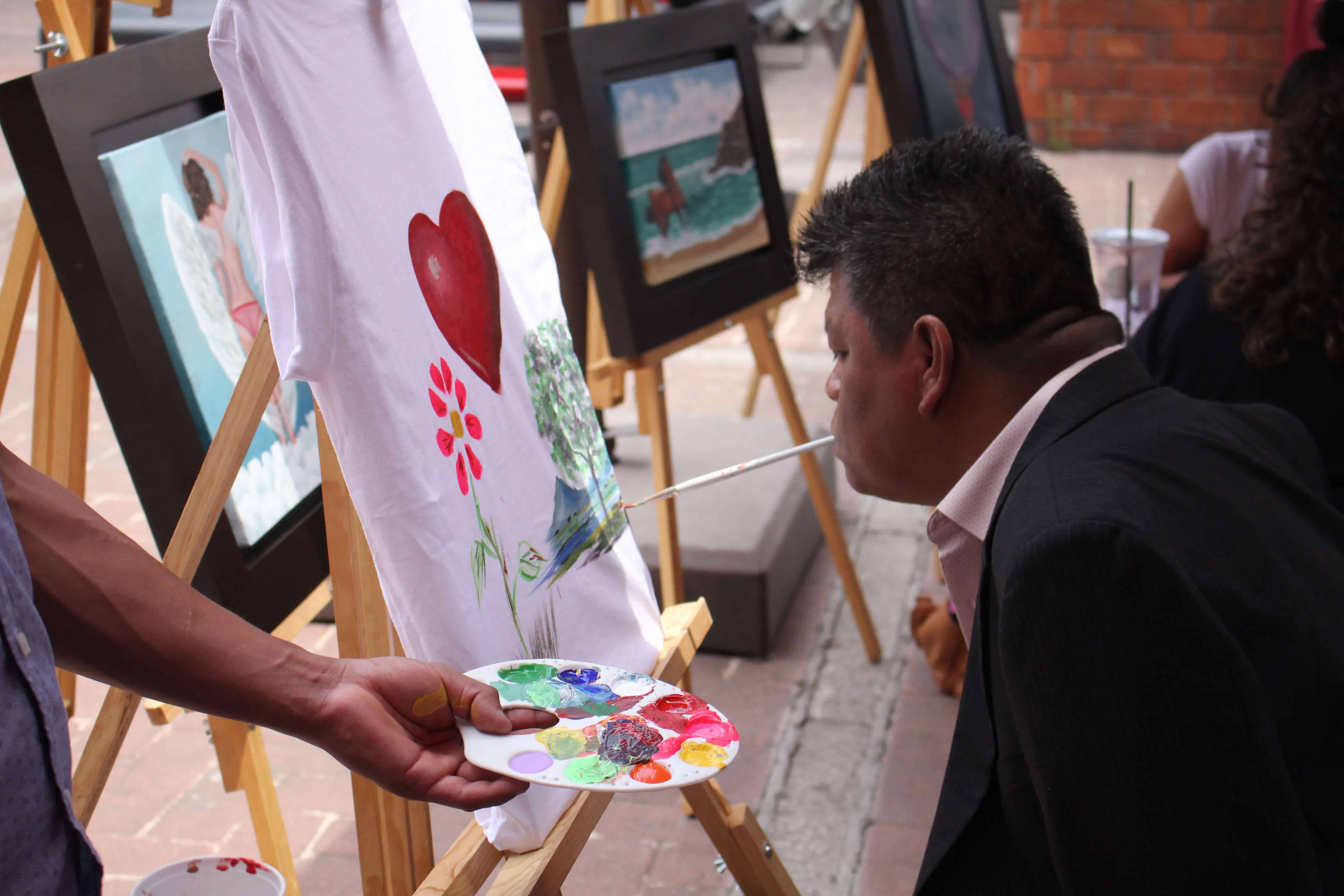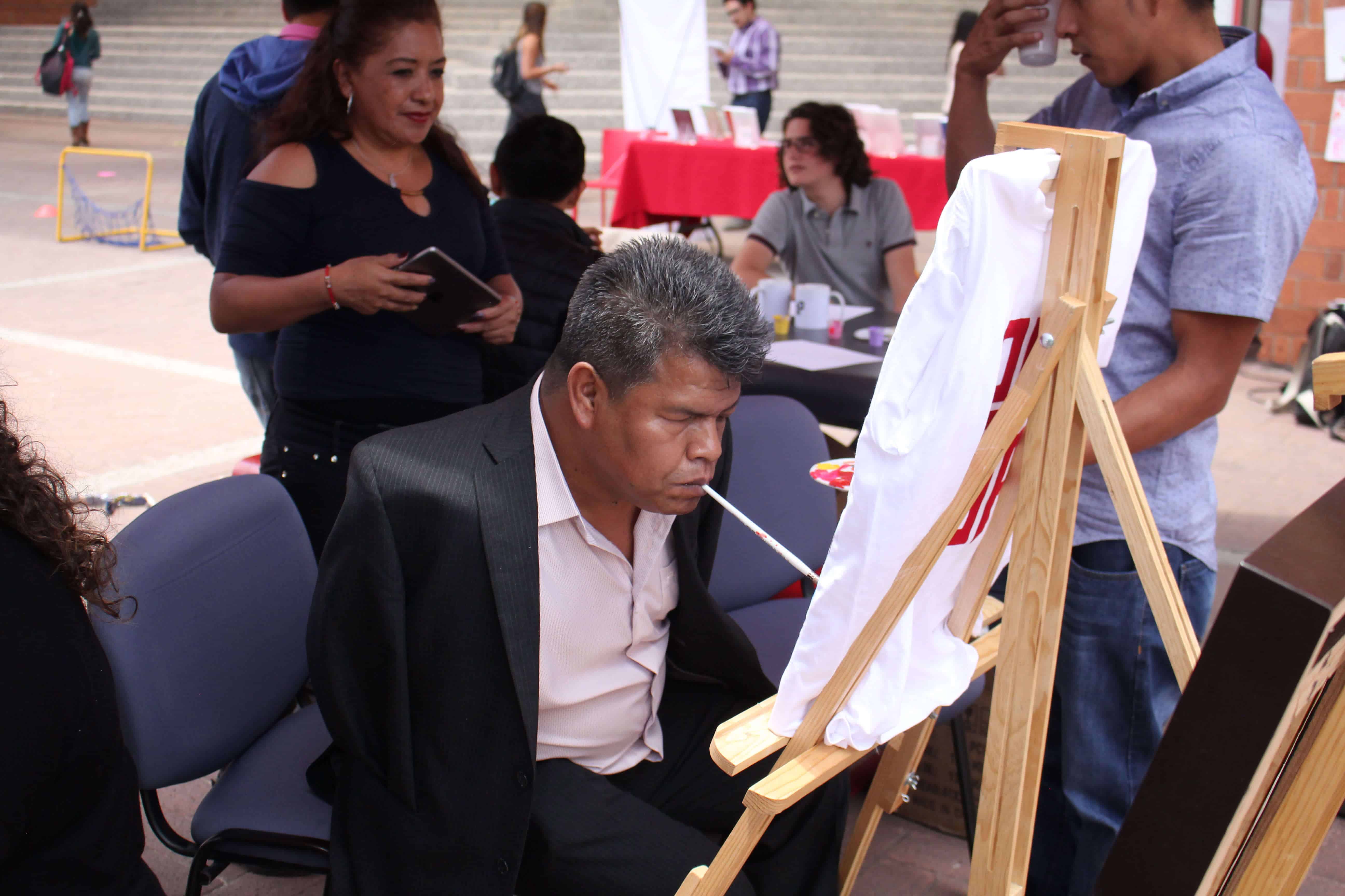 En el stand de CreARTE, el pintor con la boca José Luis Torices Gutiérrez participó en este evento de concientización y dedicó su estancia en la IBERO a mostrar su trabajo y decoró una playera, que fue entregada al final de la jornada al mejor dibujo pintado con la boca a uno de los participantes de este taller, organizado por la asociación estudiantil Arteria Urbana.