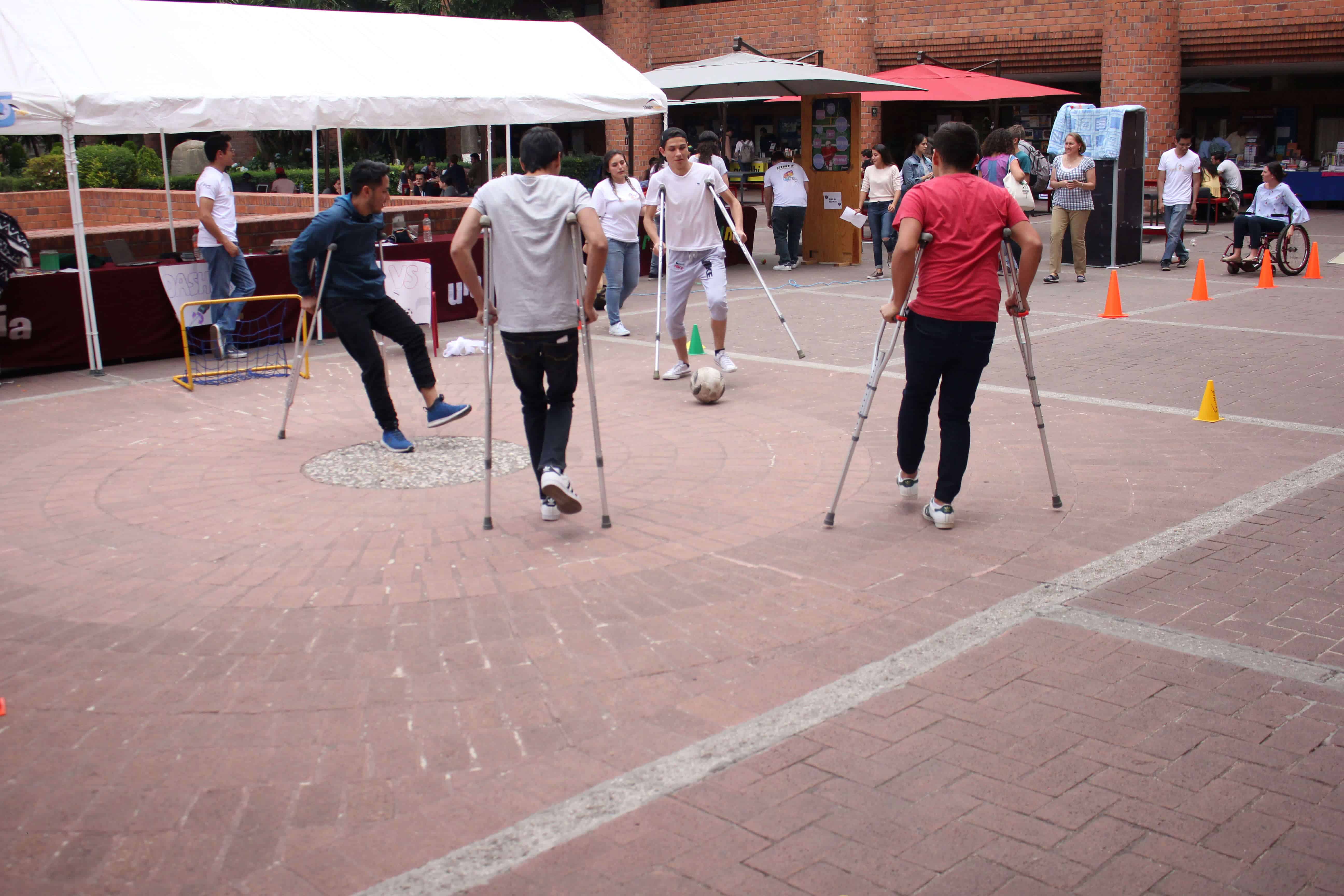En la explanada central de la IBERO, la comunidad universitaria participó en al menos 11 módulos: lenguaje de señas, braille, bastón blanco, silla de ruedas, sensorama, tiro al blanco y futbolito, prótesis, sesión de pintura y futbol en muletas, y un stand especial de textos sobre inclusión.