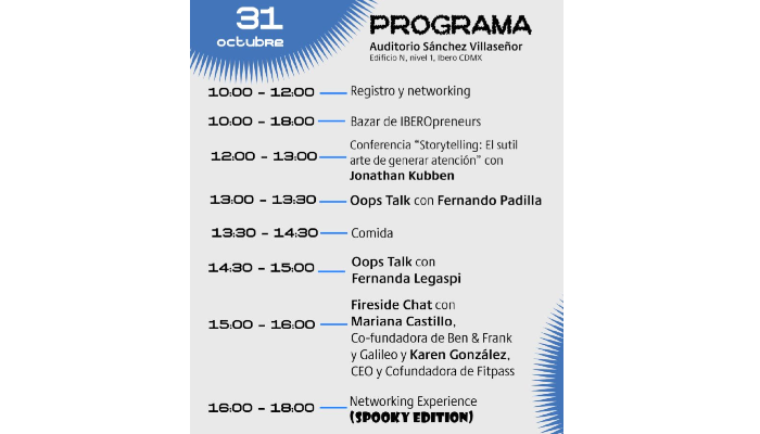 El 31 de octubre, IBEROpreneur Week tomará el emblemático auditorio Sánchez Villaseñor con un programa que incluye un bazar de emprendimientos, conferencias, y la Networking (Spooky Edition), que permitirá conectar, colaborar y celebrar con temática de Halloween.