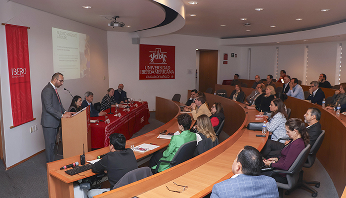 La Dra. Teruel ofreció un panorama de la historia y estructura de la Universidad Iberoamericana desde su fundación, en 1943, pasando por su establecimiento en su actual campus de Santa Fe en 1988, tras el terremoto de 1979. Señaló que pertenece de la red mundial de más de 190 universidades jesuitas y una de las ocho que existen en México; cuenta con más de 10 mil alumnas y alumnos en sus 36 licenciaturas y 800 en sus más de 40 posgrados (18 de ellos de excelencia académica); 420 de sus profesores y profesoras son de tiempo completo y más de 1800 son de cátedra. Y 156 pertenecen al Sistema Nacional de Investigadores.