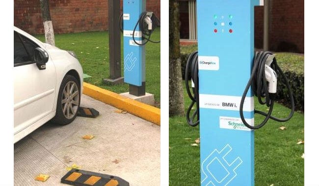 La estación de carga Evlink, fabricada por Schneider Electric, está ubicada en el estacionamiento E9, donde tiene asignados dos cajones de aparcamiento, ya que puede cargar de electricidad a un par de vehículos al mismo tiempo, sin importar de qué marca sean, pues la Evlink es compatible con cualquier vehículo eléctrico que utilice el formato americano SAE J1772.