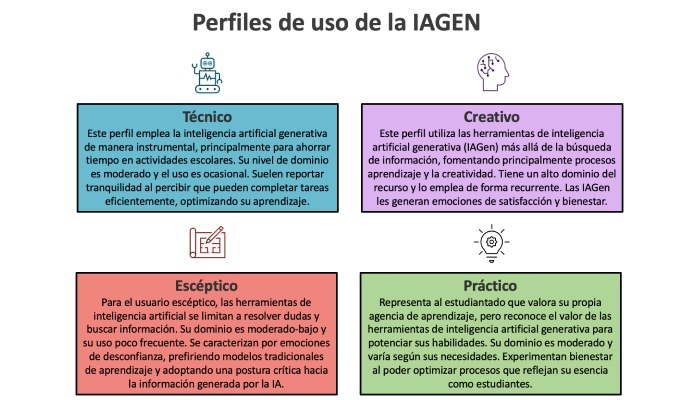 Explicó que estos perfiles reflejan una gama de actitudes hacia la IA que van de la desconfianza hasta el entusiasmo creativo. Según los resultados del estudio, quienes se identifican como creativos suelen tener un mayor dominio de la tecnología y la utilizan con más frecuencia, mientras que las y los escépticos muestran una menor integración para usar esta herramienta.