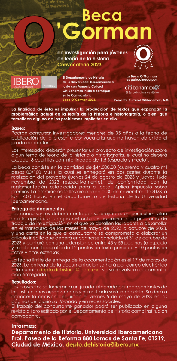 Dedicada a Edmundo O’Gorman, uno de los historiadores más destacados del Siglo XX -y quien también fue catedrático de nuestra IBERO- la beca consiste en la cantidad de $44,000.00 (cuarenta y cuatro mil pesos), que se entregarán en dos partes durante la realización del proyecto; la primera, el jueves 24 de agosto y la segunda, el 16 de noviembre de 2023, de conformidad con la reglamentación establecida para el caso. Aplica impuesto sobre premios. La premiación se llevará a cabo el 30 de noviembre a las 17 horas, en el departamento de Historia de la Universidad Iberoamericana.