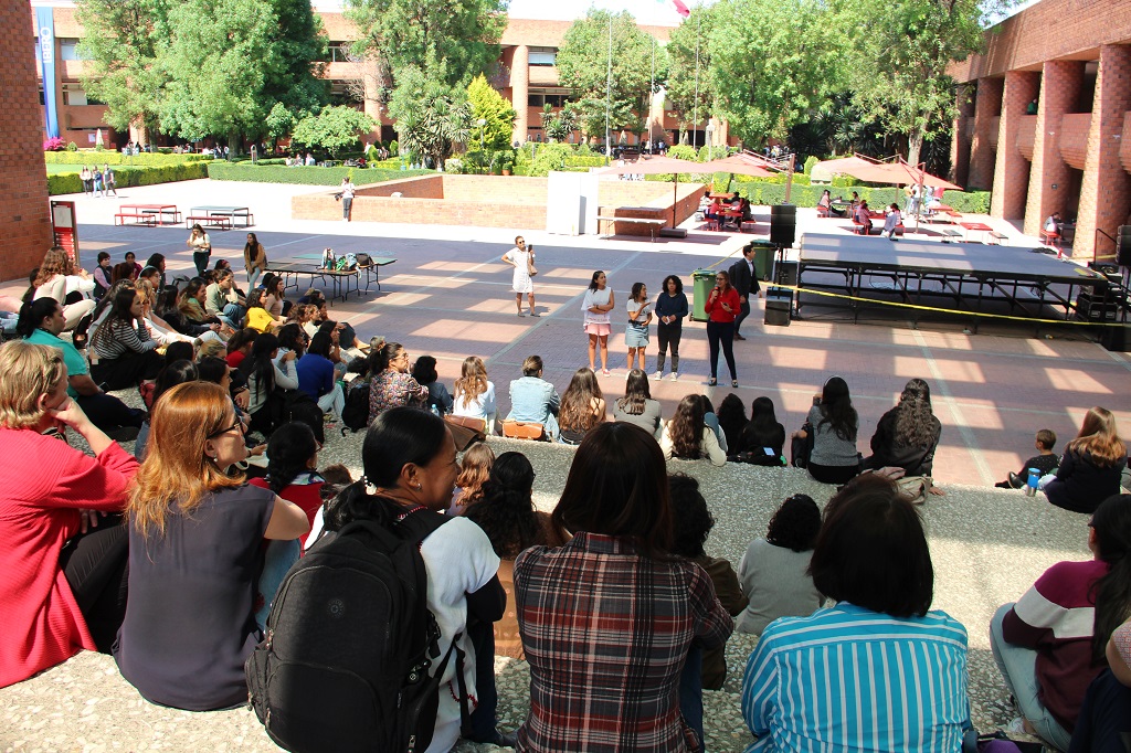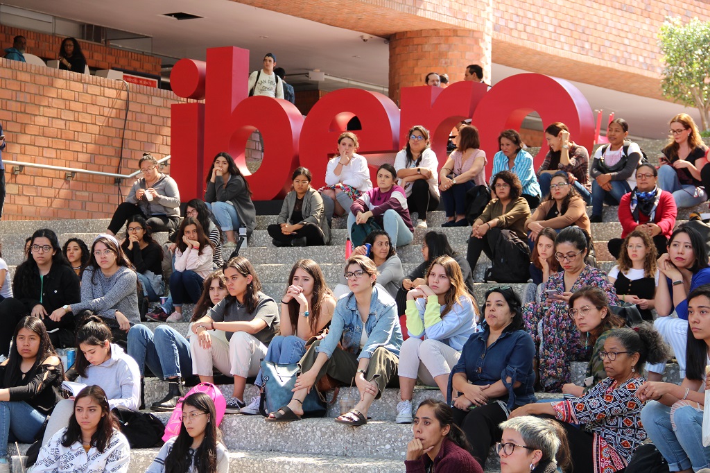 Alumnas, académicas e integrantes de personal administrativo y de servicio de la Universidad Iberoamericana participaron en la Asamblea de Mujeres que se realizó en la explanada central de esta institución educativa para dialogar sobre las razones que las motivan a participar en el paro nacional que se realizará el próximo 9 de marzo.