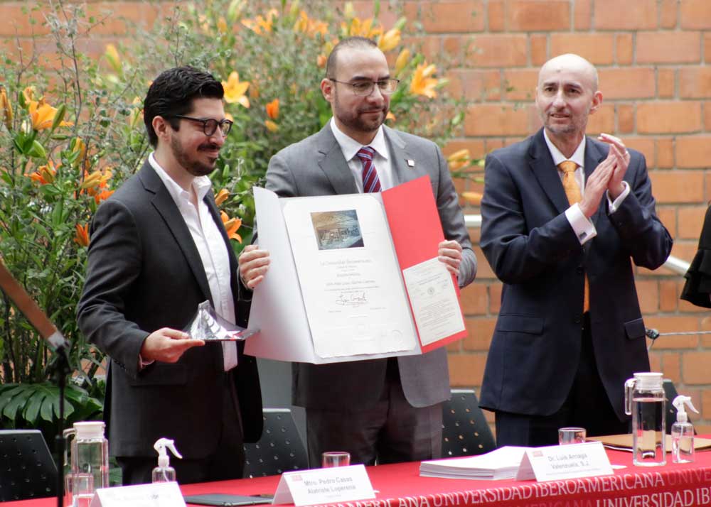 • El Dr. Luis Arriaga Valenzuela, Rector de nuestra Ibero, y el Dr. Alejandro Anaya, Vicerrector, le entregaron un reconocimiento al Mtro. Pedro Casas Alatriste, egresado de Economía. Fotos: Alberto Hernández Mendoza y Jorge Luis Cortés.