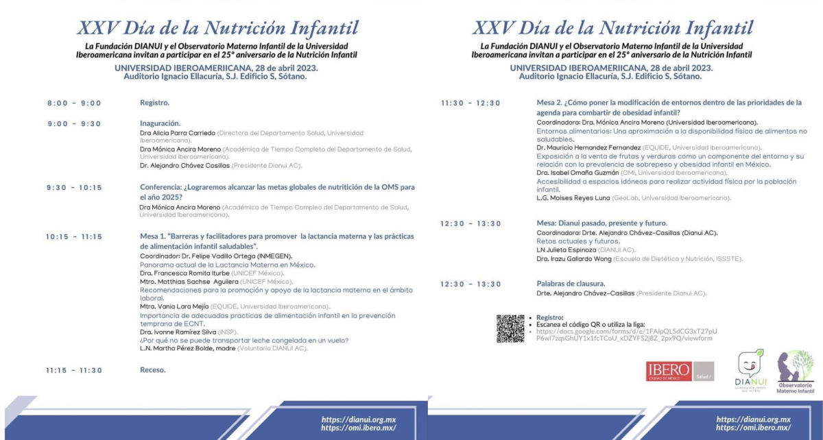 Como parte de los esfuerzos del Departamento de Saludde la IBERO por difundir más sobre este problema de salud pública, este 28 de abril de este 2023, se realizará un evento por el “XXV Aniversario del Día de la Nutrición Infantil”, organizado por la Fundación DIANUI y el Observatorio Materno Infantil de nuestra Universidad.