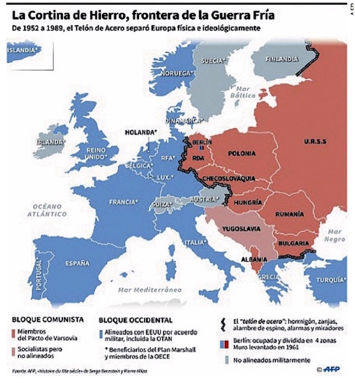 Este término fue utilizado por el británico Winston Churchill para referirse a la separación -primero ideológica y luego física- en Europa a partir del fin de la Segunda Guerra Mundial, la cual marcaba la zona de influencia soviética en el Este con los países occidentales. A continuación, se muestra un mapa con este telón invisible pero palpable.