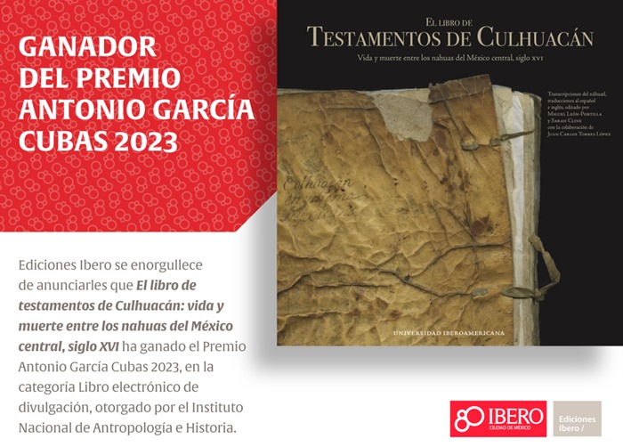 Este jueves 4 de octubre, el Instituto Nacional de Antropología e Historia (INAH), mediante el jurado de los premios Antonio García Cubas, otorgó este galardón en su convocatoria correspondiente a 2023 a El libro de testamentos de Culhuacán: vida y muerte entre los nahuas del México central, siglo XVI, publicado por la Biblioteca Francisco Xavier Clavigerode nuestra IBERO Ciudad de México, en la categoría de libro electrónico de divulgación.
