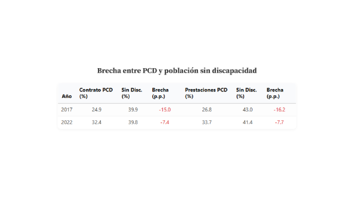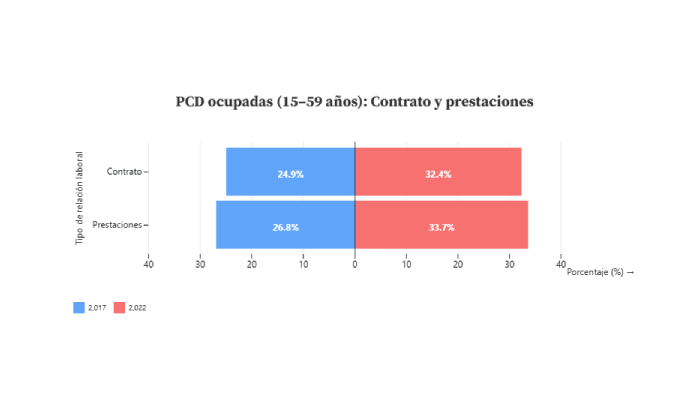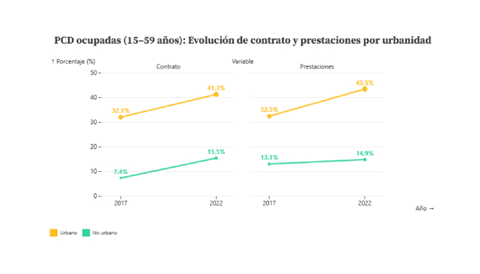 Entre 2017 y 2022, el panorama laboral para las personas con discapacidad mejoró de forma modesta pero significativa. La proporción de quienes cuentan con un contrato formal aumentó de 24.9% a 32.4%, y el acceso a prestaciones médicas pasó de 26.8% a 33.7%. El avance es más notorio en zonas no urbanas, es decir zonas rurales, donde el empleo con contrato prácticamente se duplicó (de 7.4% a 15.5%), mientras que en las zonas urbanas pasó del 32.1% a 41.3% .