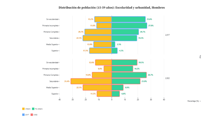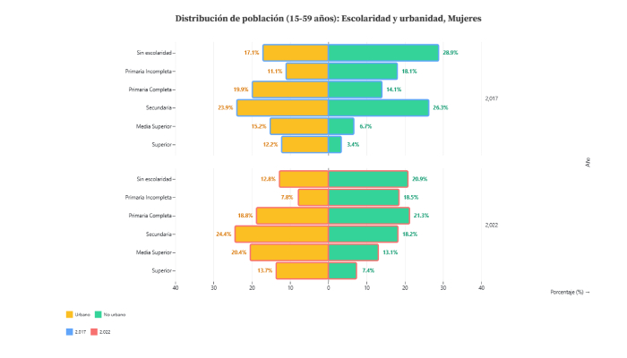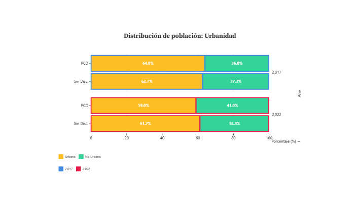 La comparación de los datos de la ENADIS 2017 y 2022 muestra que las personas con discapacidad (PCD) se concentran en edades avanzadas: casi la mitad tiene 60 años o más (55%) , frente a apenas 10% en la población sin discapacidad. Mientras que en la población sin discapacidad prevalece un perfil joven (25% entre 15 y 29 años), en la PCD este grupo apenas alcanza 9-10%. En cuanto a la residencia, la diferencia es más sutil, pero se puede entrever que después de transcurrir 5 años se ha aumentado la residencia en zonas rurales tanto para personas con discapacidad como sin discapacidad, destacando este cambio en el primer grupo con una diferencia de 5 puntos porcentuales.