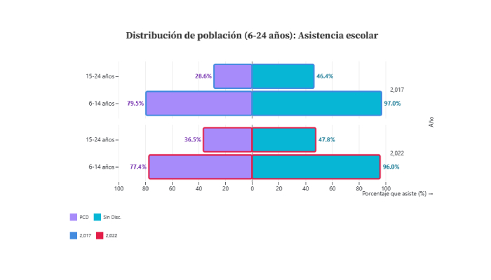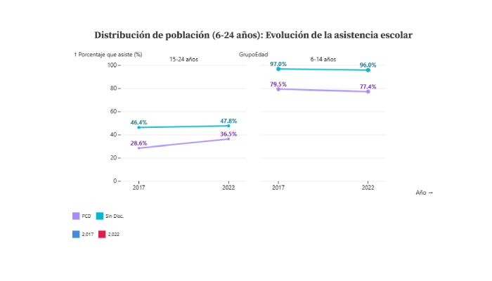 Entre las PCD de 15 a 24 años subió la asistencia escolar de 28.6% a 36.5% , una señal de inclusión a la educación superior y media que vale celebrar. En la niñez, sin embargo, cayó un poco (6-14 años: de 79.5% a 77.4%) , mientras que en la población sin discapacidad se mantiene con poca variación (6-14 años: de 46.4% pasó a 47.8% y 15-24 años: de 97.0% pasó a 96.0%).